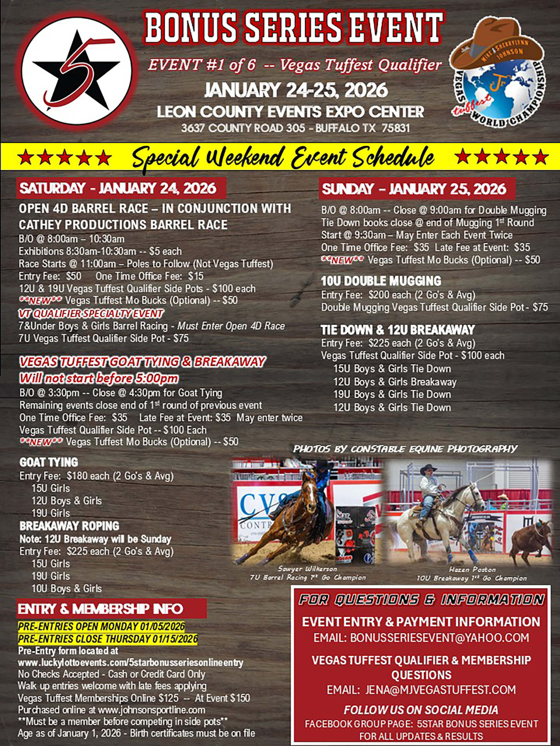 | 1/24-25/2026 | Buffalo | Texas | 5Star Bonus Series | SherryLynn Johnson | 903-926-2233 | FLYER |