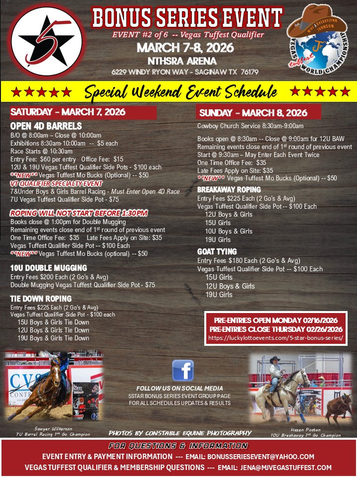 | 3/7-8/2026 | Saginaw | Texas | 5Star Bonus Series | SherryLynn Johnson | 903-926-2233 | FLYER INFO |